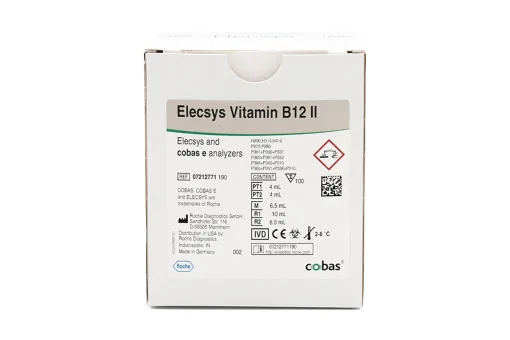Реагент Vitamin B12 II покоління призначений для кількісного визначення рівня вітаміну B12 у сироватці та плазмі крові людини. Аналіз виконується методом електрохемілюмінісцентного імуноаналізу (ECLIA) на автоматичних системах Roche Elecsys, Cobas та Modular.